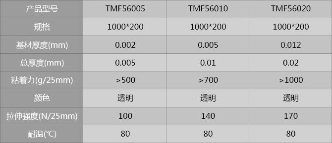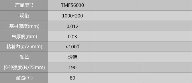 特性:是一款具有高透明,高粘性及超薄薄膜双面胶带,由PET基材和改良压敏胶胶水构成。能利用极薄的胶层达到非常强的粘着效果,同时超薄的结构设计不仅使产品顺应电子产品薄型化的潮流,也降低了客户使用时热阻隔系数,更有利于一些结构组件,特别是散热元件的粘接固定。